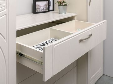Дизайн комода Нелли — это современное прочтение классического исполнения. Нежный оттенок фасадов органично дополняют элегантная фрезеровка и приятные на ощупь ручки. Ящики выдвигаются на всю глубину, открывая полный обзор содержимого и облегчая поиск нужной вещи.<br>