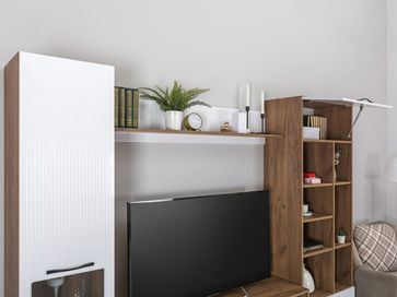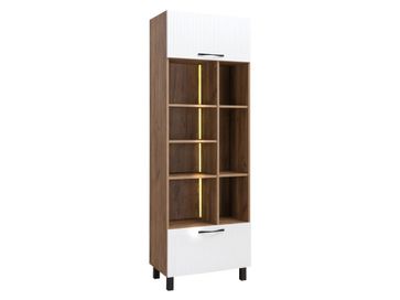 Стеллаж с подсветкой Манхеттен станет функциональным элементом интерьера, предлагая комбинированное наполнение и оригинальный внешний вид. Белые фасады декорированы вертикальными линиями фрезеровки и удачно сочетаются с теплым древесным оттенком корпуса. Открытые полки оснащены подсветкой.<br>