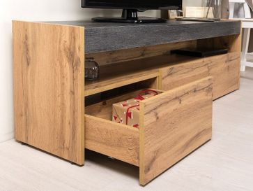 ТВ-тумба Интра с большой столешницей и надежной конструкцией позволяет установить телевизор любой диагонали. Модель имеет открытую полку и три выдвижных ящика. Тумба оснащена отверстием с заглушкой для аккуратного размещения проводов. Ящики укомплектованы скрытыми направляющими с доводчиками, благодаря которым выдвижение осуществляется легко и бесшумно. За счет регулируемых опор модель можно установить даже на неровном полу.<br>