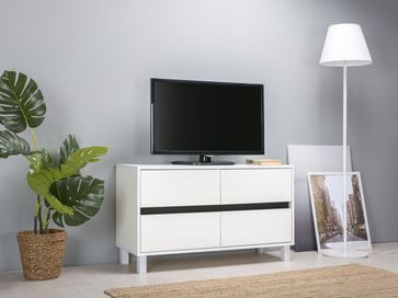 ТВ-тумба Квадро — оригинальное дополнение современного интерьера, функциональность которого позволит расположить крупную мультимедиа-технику и организовать удобное хранение личных вещей. В столешнице имеется вырез под провода. Опоры можно отрегулировать, чтобы удачнее разместить модель на неровном полу.<br>