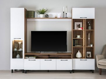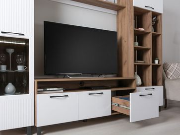 ТВ-тумба Манхеттен отлично подойдет для размещения в интерьере современной гостиной. Модель имеет открытую нишу во всю ширину и оснащена тремя вместительными выдвижными ящиками на шариковых направляющих. Задняя стенка оборудована специальным отверстием для проводов.<br>