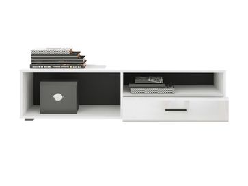 ТВ-тумба Глосс — функциональное решение для меблировки спальни или гостиной. Открытая ниша подойдет для размещения игровой консоли, роутера или пары книг, а выдвижной ящик спрячет полезные мелочи. Универсальное белое исполнение хорошо сочетается с другой мебелью. Оригинальная дверца, снабженная газлифтом и петлями, откидывается вниз для экономии пространства.<br>