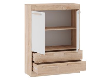 Комод Оксфорд Лайт станет изюминкой интерьера благодаря стильному сочетанию белых глянцевых фасадов и каркаса оттенка натурального дерева. Внутреннее наполнение, представленное закрытой секцией с полкой и двумя выдвижными ящиками, поможет организовать аккуратное хранение вещей.<br>