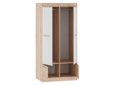 Распашной шкаф Оксфорд Лайт станет изюминкой интерьера благодаря стильному сочетанию белых глянцевых фасадов и каркаса оттенка натурального дерева. Модель оснащена горизонтальными штангами и полками, где можно аккуратно разместить сезонную одежду, обувь и другие вещи.<br>