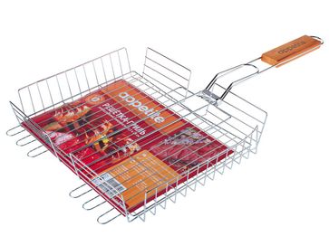 Решетка для гриля Аппетит прекрасно подходит для приготовления блюд на мангале. Высокие бортики позволят удобно разместить объемные куски мяса, овощей или рыбы, а деревянная накладка на ручке защитит от ожога.<br>