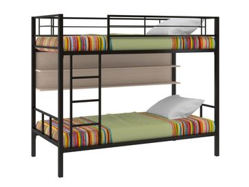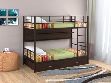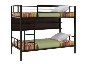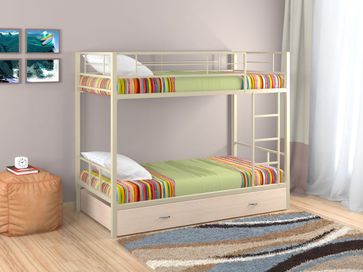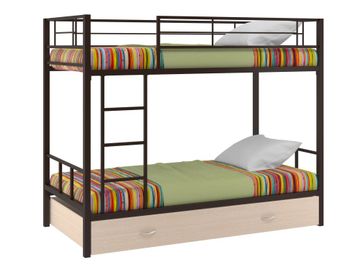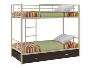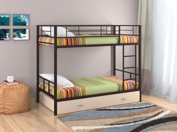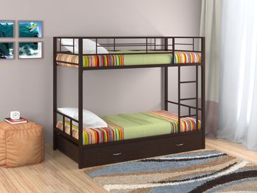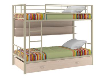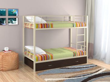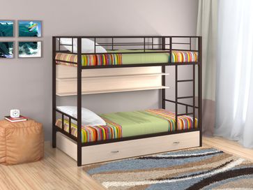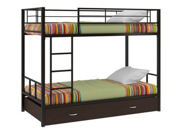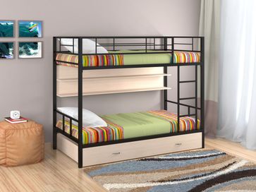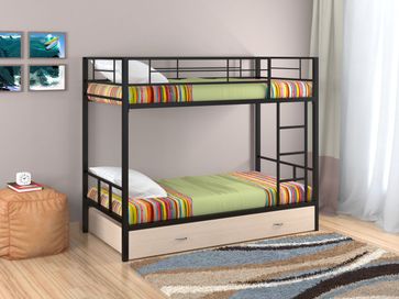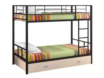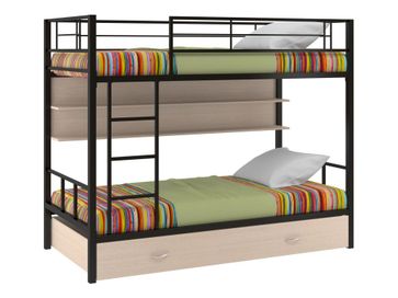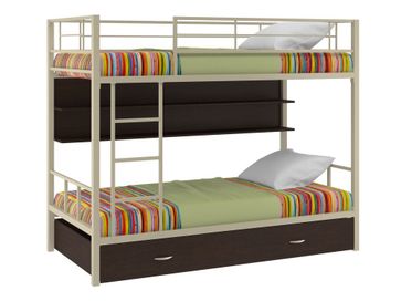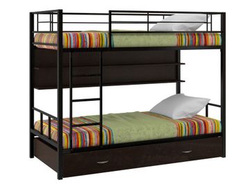 Характеристики: <br> Материал каркаса: сталь.<br> Материал ящика и полки: ЛДСП.<br> Высота нижнего спального места от пола: 285 мм.<br> Высота верхнего спального места от нижнего: 930 мм.<br> Высота бортика: 370 мм.<br> Максимальная нагрузка на верхнее спальное место: 150 кг.<br> Максимальная нагрузка на нижнее спальное место: 200 кг.<br> Лестницу можно установить как с правой, так и с левой стороны.<br> Выкатной ящик на колесных опорах.<br> Габариты полки (ВхШхГ): 430 х 1900 х 150 мм.<br> Габариты ящика (ШхГ): 1900 х 900 мм.<br>