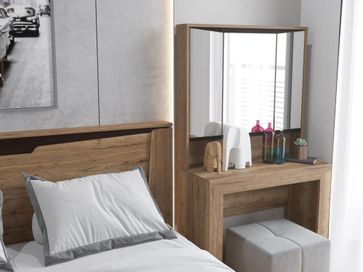С помощью туалетного столика Гарда легко обустроить уютный уголок для нанесения макияжа и процедур по уходу. Полочки за зеркалами позволят держать под рукой всю необходимую косметику, аксессуары, украшения и парфюмерию. Благодаря простым линиям и натуральным оттенкам модель легко сочетается с современными интерьерами.<br>