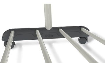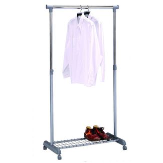 Гардеробная вешалка с полочкой для обуви. Высота штанги регулируется благодаря телескопическим опорам (от 930 до 1680 мм). Максимальная нагрузка на штангу — 15 кг. А маневренные колесики позволят вам легко передвигать даже нагруженную вешалку.<br>