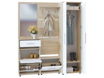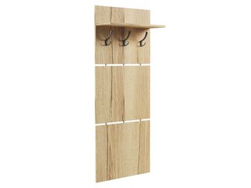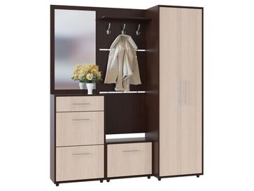 Настенная вешалка Моренго выполнена в сдержанном стиле. Модель позволит разместить сезонную одежду всей семьи. Состоит из трех панелей, соединенных металлическими вставками. Полка над крючками предназначена специально для головных уборов и зонтов.<br>