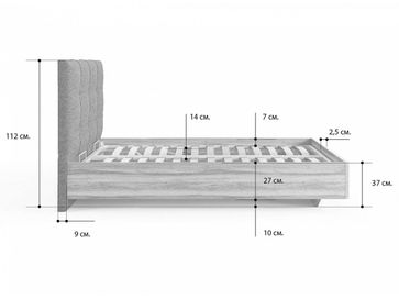 Габариты: <br> Высота ниши под матрас: 7 см.<br> Высота боковой части: 27 см.<br> Высота изголовья от основания: 75 см.<br> Полезная высота короба: 14 см.<br>