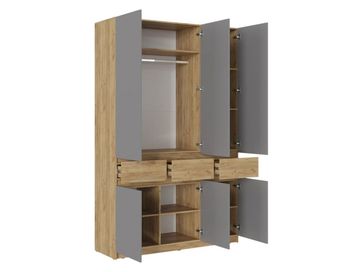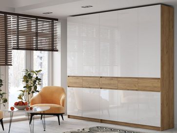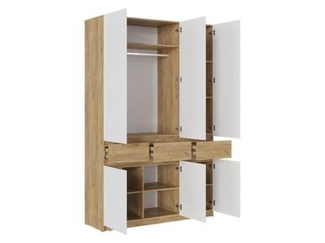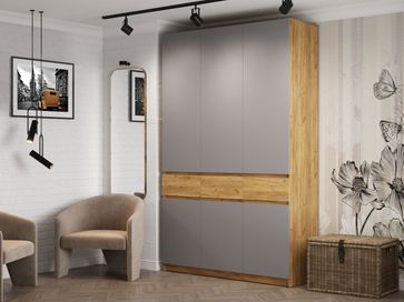 Распашной шкаф Бостон гармонично дополнит современный интерьер и расширит домашнюю систему хранения. Внутри имеются вместительная секция со штангой для плечиков и полки, которые разместят рубашки, платья и сезонные вещи. Выдвижные ящики подойдут для полезных мелочей, а закрытые ниши — для обуви. Фасады не имеют ручек и открываются при помощи зазоров, скрытых за декоративными планками.<br>