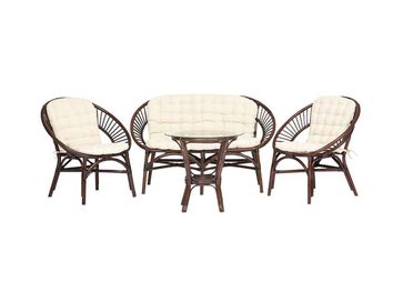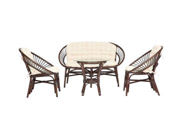 Характеристики: <br> Материал каркасов: натуральный ротанг.<br> Материал столешницы: закаленное стекло.<br> Материал обивки подушек: хлопок.<br> Материал наполнителя подушек: пенополиуретановая крошка.<br> Максимальная нагрузка на посадочное место: 120 кг.<br> None Страна производства: Индонезия
