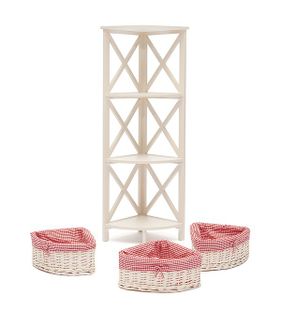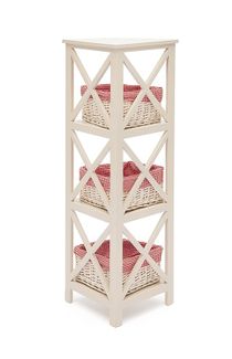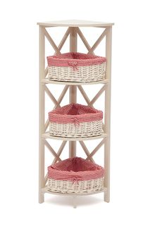 Небольшой угловой стеллаж в стиле прованс. Изделие станет стильным элементом для хранения самых разных вещей в спальне, прихожей или детской комнате. Благодаря компактным размерам, модель не займет много места. Стеллаж имеет три корзины с тканевым чехлами.<br>