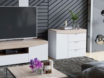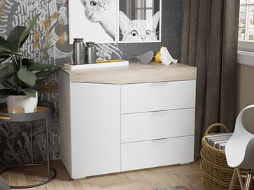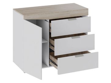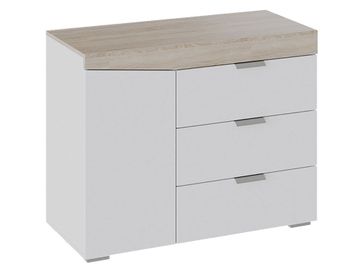 Комод Вайт позволит расширить систему хранения в комнате и добавит привычному интерьеру свежую нотку. Оригинальная геометрия столешницы и минималистичный дизайн фасадов удачно сочетаются с меблировкой в стилях сканди, лофт, минимализм и модерн. Несомненное достоинство модели — продуманная комбинация из выдвижных ящиков и ниш за распашной дверцей.<br>