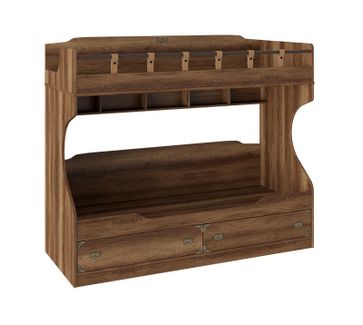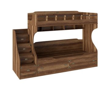 Очаровательная двухъярусная кровать Навигатор, выполненная в насыщенных древесных оттенках и декорированная металлическими деталями в морской тематике обязательно понравится как детям, так и их родителям. В комплект кровати входит приставная лестница, где каждая ступенька представляет собой выдвижной ящичек, в котором дети смогут хранить свои вещи и мелочи.<br> В состав комплекта входят (ВхШхГ): <br> Двухъярусная кровать: 1742 х 2048 х 845 мм.<br> Приставная лестница: 1213 х 466 х 845 мм.<br> <br> Характеристики: <br> Материал каркаса: ЛДСП 18 мм. Торцевые края обработаны ABS кромкой 2 мм, остальные детали — меламиновой кромкой 0,4 мм.<br> Материал ручек и декоративных накладок: металл.<br> Ориентация сборки: универсальная.<br> Тип направляющих: шариковые полного выдвижения с доводчиками.<br> <br>