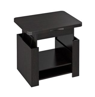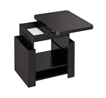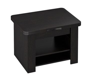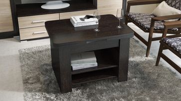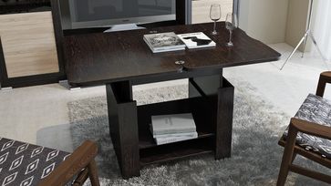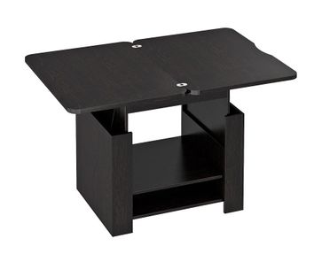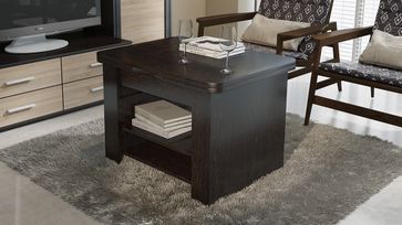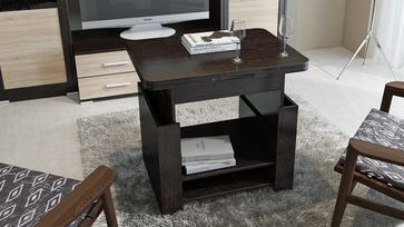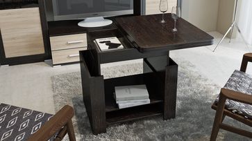 В конструкцию столика заложен подъемный и раскладной механизм, превращающий его из журнального в небольшой рабочий или обеденный стол на четыре персоны. В основании предусмотрено две полки для необходимых под рукой мелочей.<br>