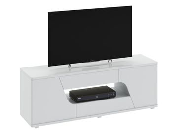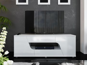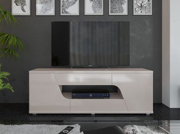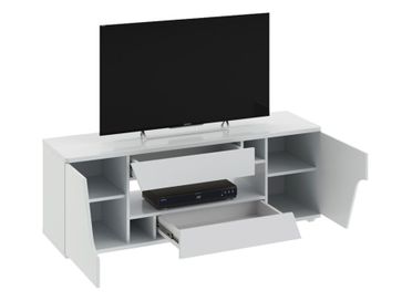 Тумба под ТВ Даймонд 140 станет оригинальным акцентом в интерьере гостиной благодаря глянцевой поверхности и дверцам необычной формы. На фасадах закрытых секций отсутствуют ручки, поэтому открытие ящиков происходит с помощью захвата рукой.<br /> Вместительные полки помогут аккуратно разложить под телевизором игровую консоль, роутер, пульт и другие необходимые под рукой вещи.<br>
