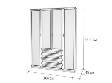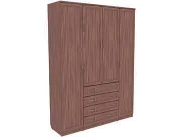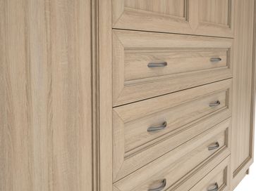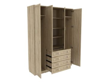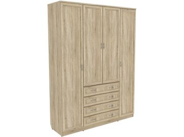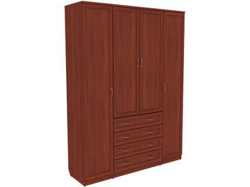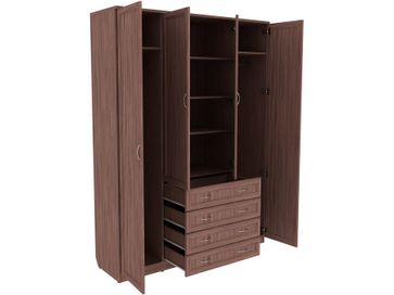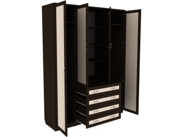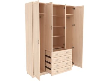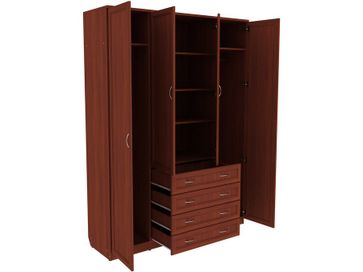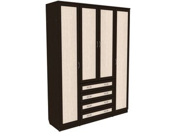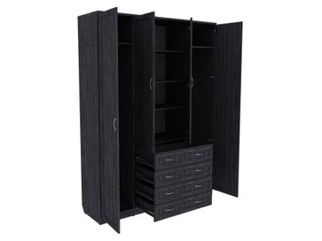 Преимущества: <br> отделение со штангой — для одежды на плечиках;<br> четыре выдвижных ящика — вместо комода;<br> два отделения с полками — для белья, вещей, обуви;<br> роликовые направляющие в ящиках — практичный механизм;<br> металлические ручки — прочные и долговечные;<br> объемная МДФ рамка на фасадах;<br> универсальный — для спальни, гостиной, квартиры-студии.<br>