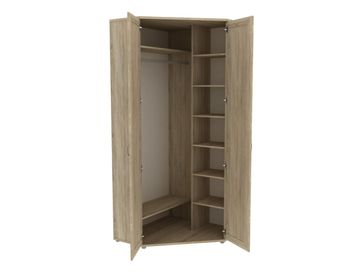 Угловой шкаф Леонардо поможет организовать полноценную систему хранения всех предметов гардероба, сопутствующих аксессуаров и всевозможных мелочей. Благодаря особенностям конструкции он не займет лишнего пространства и отлично впишется в интерьер. За распашными дверями расположились шесть открытых ниш, антресольная и нижняя полки, а также штанга для плечиков.<br>