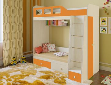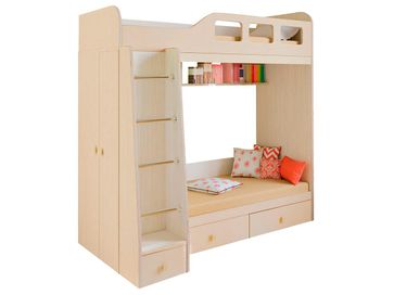 Практичная двухъярусная кровать Астра-3 понравится родителям двоих малышей разных возрастов. Особенность модуля в наличии спальных мест разного размера: верхний этаж отлично подойдет для старшего ребенка, а нижний для младшего. Все углы имеют безопасные скругления, верхний ярус оборудован бортиком с окошками.<br> Характеристики: <br> Материал: ЛДСП 16 мм с кромкой ПВХ 0,4 и 0,2 мм.<br> Материал перекладин лестницы: металл.<br> Ориентация сборки: универсальная.<br> Наполнение: распашной шкаф с продольной штангой и полками, два выдвижных ящика, полочка для книг и игрушек.<br> Тип направляющих: роликовые.<br> <br>