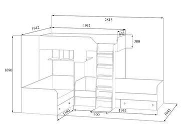 Характеристики: <br> Материал каркаса: ЛДСП 16 мм.<br> Высота верхнего спального места от пола: 1390 мм.<br> Рекомендуемая высота матраса: до 170 мм.<br> Высота бортика: 300 мм.<br> Максимальная нагрузка на спальное место: 100 кг.<br> Ориентация сборки: универсальная.<br> Выкатные ящики на колесных опорах.<br> <br>