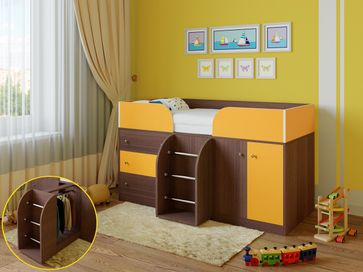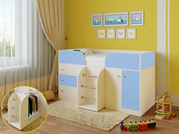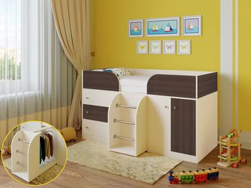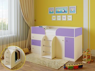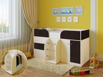Оригинальная конструкция кровати-чердака Астра-5 понравится как малышам, так и их родителям. Комплекс имеет небольшой размер и станет идеальным вариантом для маленькой детской комнаты. Особенность модели — выдвижная лесенка по центру, внутри которой скрывается небольшой шкафчик со штангой.<br>