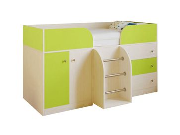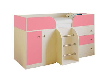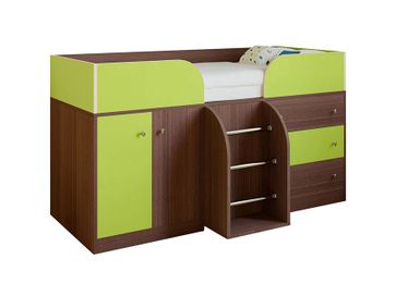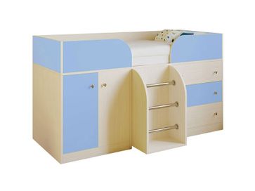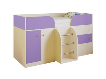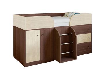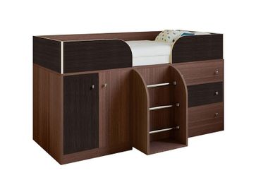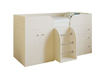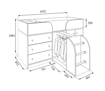 Характеристики: <br> Материал каркаса: ЛДСП 16 мм.<br> Материал перекладин лестницы: металл.<br> Рекомендуемая высота матраса: 100-150 мм.<br> Высота бортика: 290 мм.<br> Максимальная нагрузка на спальное место: 90 кг.<br> Ориентация сборки: универсальная.<br> Наполнение: шкаф со штангой, три выдвижных ящика.<br> Тип направляющих: роликовые.<br>