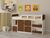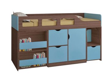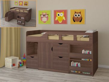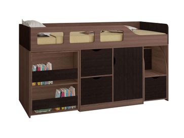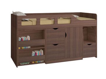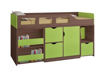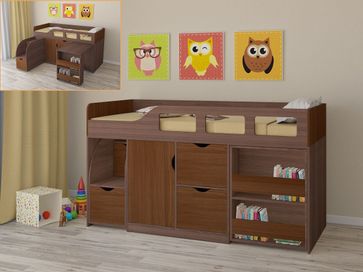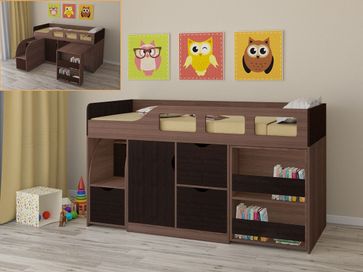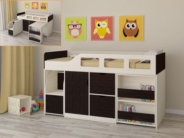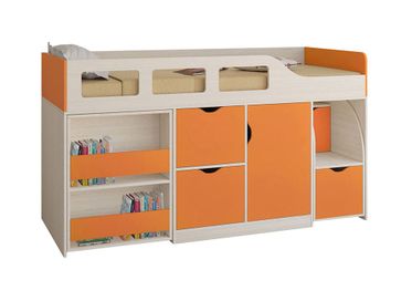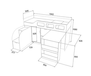 Характеристики: <br> Материал каркаса: ЛДСП 16 мм.<br> Высота спального места от пола: 800 мм.<br> Рекомендуемая высота матраса: 100-150 мм.<br> Высота бортика: 280 мм.<br> Максимальная нагрузка на спальное место: 70 кг.<br> Тип направляющих: роликовые.<br> Ориентация сборки: универсальная.<br> Наполнение: открытые полочки, выдвижная лестница с ящиками, выдвижной письменный стол, распашной шкаф с полкой.<br> Размер стола (ВхШхГ): 744 х 827 х 607 мм.<br>