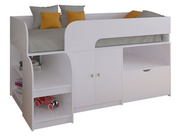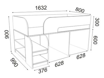Характеристики: <br> Материал каркаса: ЛДСП 16 мм.<br> Высота спального места от пола: 600 мм.<br> Рекомендуемая высота матраса: до 170 мм.<br> Высота бортика: 300 мм.<br> Максимальная нагрузка на спальное место: 100 кг.<br> Ориентация сборки: универсальная.<br> Наполнение: открытые полочки, выкатной ящик, распашной шкафчик с полкой.<br> <br>