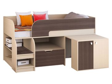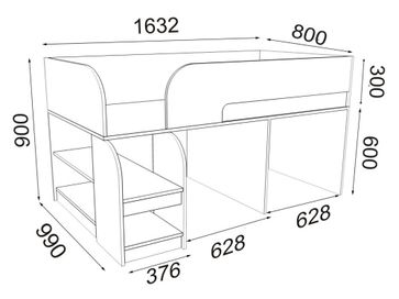 Характеристики: <br> Материал каркаса: ЛДСП 16 мм.<br> Высота спального места от пола: 600 мм.<br> Рекомендуемая высота матраса: до 170 мм.<br> Высота бортика: 300 мм.<br> Максимальная нагрузка на спальное место: 100 кг.<br> Ориентация сборки: универсальная.<br> Наполнение: открытая ниша, выдвижной ящик на колесиках, открытые полки, выдвижной столик-тумба с полками за распашными дверцами.<br> Размер стола (ВхШхГ): 573 х 840 х 608 мм.<br> <br>