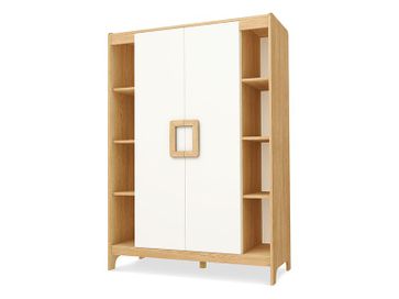 Широкий платяной шкаф c оригинальными ручками; В левой части шкафа, за дверкой, три полки; В правой части сверху расположена полка, под которой штанга - на ней можно развесить вещи; По бокам по три открытые полочки, на которых можно разместить фотографии, статуэтки и т.д. Необходима предоплата. Возможна рассрочка. Страна производства: Польша Возможен самовывоз. Есть доставка.