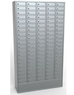 шкаф АШ 100 абонементный на 100 «глухих» ячеек под формат А5 без прорезей под корреспонденцию и сервисной двери; каркас – профильная труба 20х20 мм; дверки и панели – 0,7 мм; цвет – серый металлик (RAL 9006); замок – индивидуальный, EUROLOCK (1000 ед.); размер ячейки - 60х170х305 None