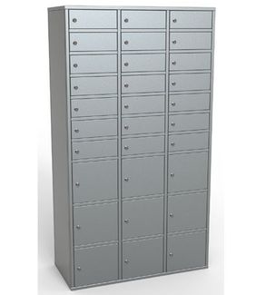 шкаф АШ 21/9 для почты на 30 «глухих» ячеек под формат А4 без прорезей под корреспонденцию и сервисной двери; каркас – профильная труба 20х20 мм; дверки и панели – 0,7 мм; цвет – серый металлик (RAL 9006); замок – индивидуальный, EUROLOCK (1000 ед.); вес – 95 кг. размер ячейки маленькой (21 шт.): 100х270х390 размер ячейки большой (9 шт.): 237х270х390 None