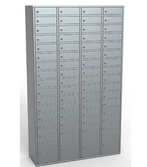 шкаф железный на 64 «глухих» ячейки под формат А4 без прорезей под корреспонденцию и сервисной двери; каркас – профильная труба 20х20 мм; дверки и панели – 0,7 мм; цвет – серый металлик (RAL 9006); замок – индивидуальный, EUROLOCK (1000 ед.); размер ячейки - 82х250х340 None