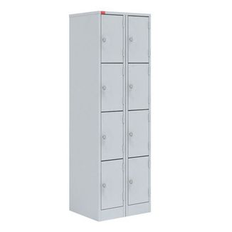 Металлический разборный шкаф из восьми ячеек используется для хранения пакетов и сумок в крупных магазинах, личных вещей в раздевалках спортклубов и фитнес-центров. None
