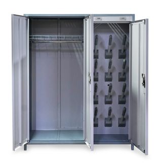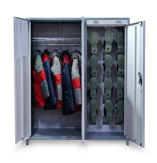шкаф RANGER 5 имеют две секции - первая из двух секций для просушивания одежды, оснащена перекладиной для вешалок и полкой для головных уборов; вторая секция предназначена исключительно для сушки обуви; просушивание осуществляется путем развешивания обуви на специальные штанги через которые подается теплый воздух.