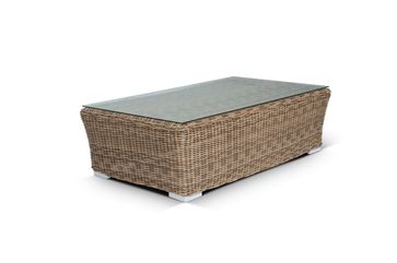 Высококачественный и неприхотливый искусственный ротанг серо-желтого оттенка Круглое плетение Прочный алюминиевый каркас Алюминиевое основание ножек Столешница обеденного стола изготовлена из крепкого закалённого стекла толщиной 5 мм Вся мебель сделана вручную нашими квалифицированными специалистами В солнечных лучах плетение приобретает более светлый и яркий оттенок Подходит для использования внутри помещения и на открытом воздухе
