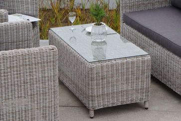 Высококачественный и неприхотливый искусственный ротанг белого оттенка Круглое плетение Прочный алюминиевый каркас Алюминиевое основание ножек Столешница обеденного стола изготовлена из крепкого закалённого стекла толщиной 5 мм Вся мебель сделана вручную нашими квалифицированными специалистами В солнечных лучах плетение приобретает более светлый и яркий оттенок Подходит для использования внутри помещения и на открытом воздухе