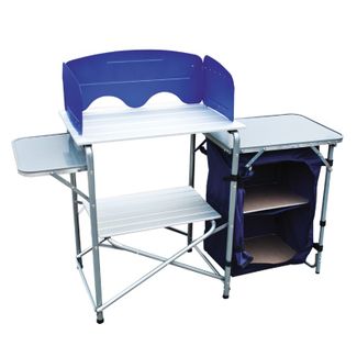 Походная кухня имеет съемный складной ветрозащитный экран, удобный шкафчик с полками для хранения посуды и продуктов. Ножки могут регулироваться по высоте, что придает дополнительную устойчивость. Кухня складывается в кейс, удобный для транспортировки и имеет дополнительный тканевый чехол, который защищает от царапин при перевозке и хранении. None