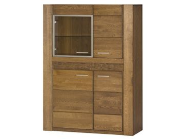 Вместительная витрина из дуба завораживает красотой натурального дерева.В верхней левой части за прозрачной стеклянной дверцей в раме, расположена полка, оборудованная подсветкой. На полку можно поставить посуду, декоративные элементы.В верхней правой части за дверцей небольшая полка.В нижней части, за двумя дверцами расположено по две полки: слева более вместительные, для больших предметов, а справа полки поменьше.Дверцы оборудованы системой тихого закрывания - они не помешают вам, когда будут закрываться. Необходима предоплата. Возможна рассрочка. Страна производства: Польша Возможен самовывоз. Есть доставка.