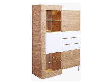 Высокая остекленная витрина асимметричной формы контрастной расцветки;Высокая витрина асимметричной формы контрастной расцветки;За двумя стеклянными дверцами по одной стеклянной полке, оборудованных подсветкой. Подсветка подчеркнет красоту посуды, статуэток, ваз, расположенных на полках;Ящики оборудованы системой тихого закрывания;Дверцы и ящики открываются при помощи ручек-выемок, расположенных в фасадной панели;В центральной части над ручками-выемками расположена подсветка, которая подчеркнет необычные формы мебели. При выдвижении ящика подсветка оссветит внутреннюю часть ящика. Необходима предоплата. Возможна рассрочка. Страна производства: Польша Возможен самовывоз. Есть доставка.