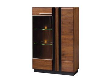 Невысокая 2-дверная витрина приятного цвета натурального дуба;В левой части за дверкой 1 деревянная полка и две полки из закаленного стекла, которые оборудованы подсветкой. Она создаст приятную атмосферу в вашем помещении;В нижней части слева одна деревянная полка;В правой части за дверкой, которая открывается при помощи скрытой ручки-выемки на боковой части фасада, три деревянные полки;Фасад элемента сделан из массива дуба. В центральной части фрезерованная деревянная часть с окантовкой из черного закаленного стекла. Необходима предоплата. Возможна рассрочка. Страна производства: Польша Возможен самовывоз. Есть доставка.