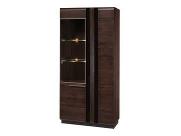 Высокая 2-дверная витрина приятного цвета натурального дуба;В левой части за дверкой две полки из закаленного стекла, которые оборудованы подсветкой. Она создаст приятную атмосферу в вашем помещении;В нижней части слева две деревянные полки. Вверху также одна небольшая полочка;В правой части за дверкой, которая открывается при помощи скрытой ручки-выемки на боковой части фасада, четыре деревянные полки;Фасад элемента сделан из массива дуба. В центральной части фрезерованная деревянная часть с окантовкой из черного закаленного стекла. Необходима предоплата. Возможна рассрочка. Страна производства: Польша Возможен самовывоз. Есть доставка.
