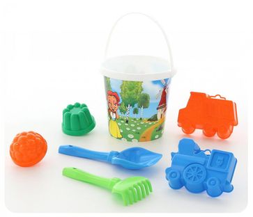 - Набор №122: ведро с наклейкой, лопатка №5, грабельки №5, формочки (самосвал + паровоз), 2 формочки по выгодной цене 204 р. руб.;