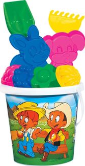 Набор №125: ведро с наклейкой, лопатка №5, грабельки №5, формочки (белочка + пёсик), 4 формочки