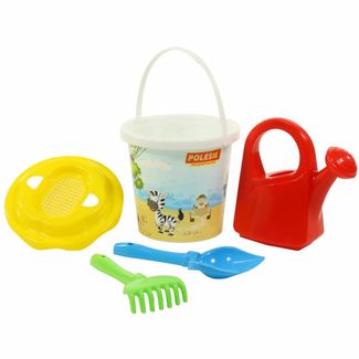 Ведро с наклейкой, ситечко "Солнышко", лопатка №5, грабельки №5 + серия объёмных игрушек - лейка большая. None