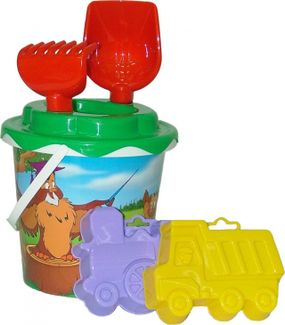- Набор №132: ведро с наклейкой, ситечко Солнышко, лопатка №5, грабельки №5, формочки (самосвал + паровоз) по выгодной цене 214 р. руб.;