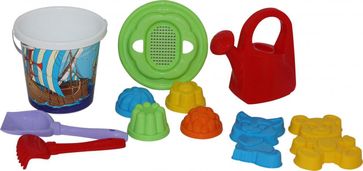 - Набор №135: ведро с наклейкой, ситечко Солнышко, лопатка №5, грабельки №5, формочки (котёнок + медведь), 4 формочки, лейка большая по выгодной цене 371 р. руб.;