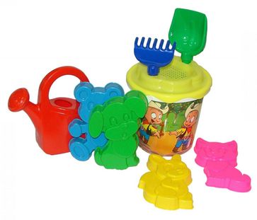 - Набор №139: ведро с наклейкой, ситечко Солнышко, лопатка №5, грабельки №5, формочки (белочка + пёсик + котёнок + медведь), лейка большая по выгодной цене 378 р. руб.;