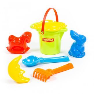 - Набор №140: ведро малое с носиком, ситечко-цветок, совок №2, грабельки №2, формочки (заяц + лошадка + месяц) по выгодной цене 248 р. руб.;